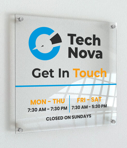 Custom 6mm Acrylic Stand-Off Sign service with polished edges and stainless steel mounts. Price shown is an example for 0.8×0.4m.